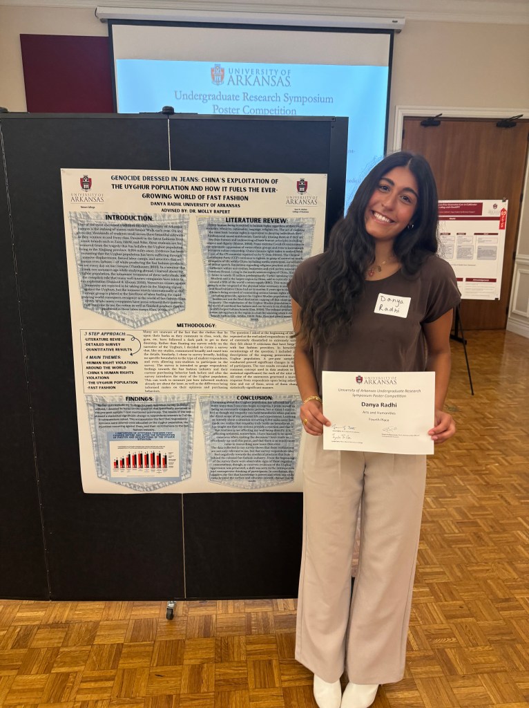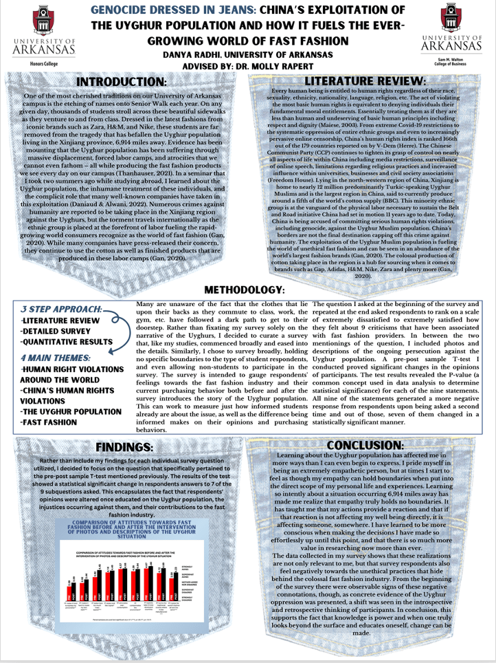 As part of my honors college curriculum, I completed an honors thesis titled Genocide Dressed in Jeans: Does Sharing a Narrative About the Uyghur Population Alter Opinions about Fast Fashion. This research stemmed from my experiences studying abroad in the summer of 2022, where I learned about the minority ethnic group behind the production of major fast fashion retailers.